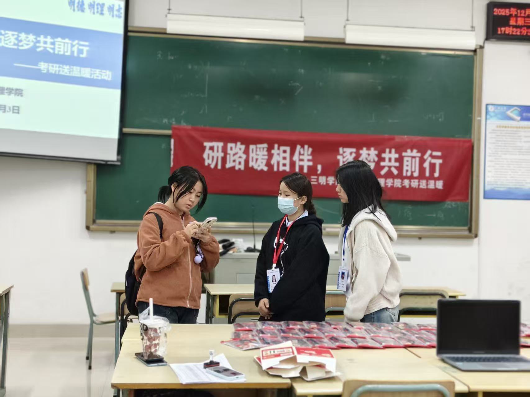 活动现场暖意融融,流程紧凑而充实。学子们签到后,领取了内含考研资料、文具套餐与祝福卡片的“考研暖心包”,实用物资为冲刺阶段的备考注入满满能量。随后,考研上岸学长学姐结合自身实战经验,围绕复习规划、专业课记忆技巧展开分享,重点拆解“如何避免假努力”的核心痛点,干货满满的分享让在场学子受益匪浅,互动答疑环节更是精准回应了大家的备考困惑。与此同时,2位专业课老师与1位辅导员分设“复习方法”“心态疏导”咨询区,一对一为学子解答薄弱科目提升、考前焦虑缓解等问题,轻缓励志的背景音则全程营造着温馨鼓劲的氛围。