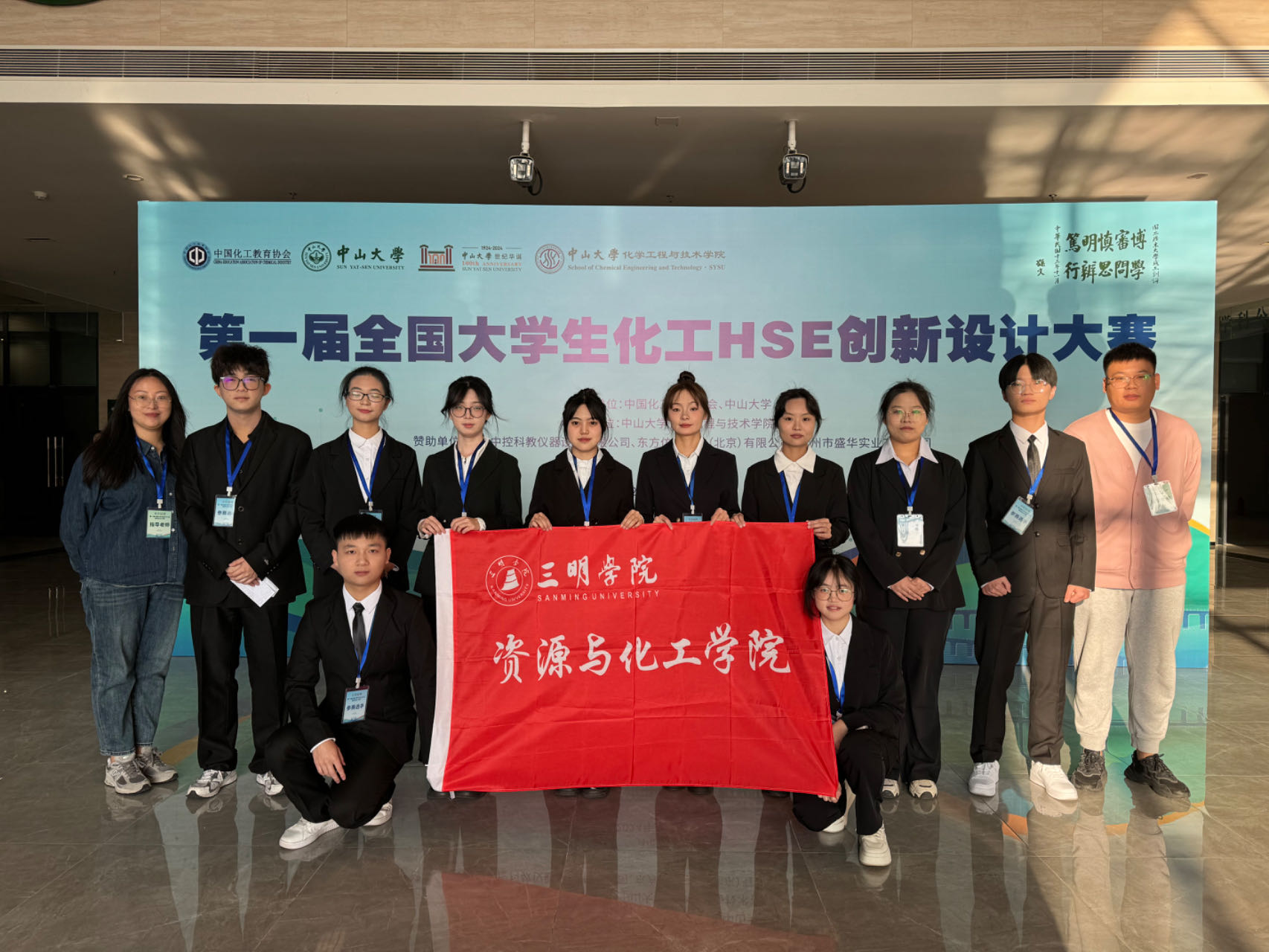 2024年12月20日至12月22日,由中国化工教育协会主办、中山大学化学工程与技术学院承办的第一届全国大学生化工HSE创新设计大赛在中山大学珠海校区举行。该赛事共收到全国98支队伍报名参赛,40支队伍进入决赛。经过激烈的角逐,由资源与化工学院2022级化工班朱靓等5位同学组成的“安全先锋队”以及由罗微等5位同学组成的“HSE守护者联盟队”在李奇勇、林明穗、杨静、孙政四位老师的指导下,均获得全国一等奖的优异成绩。
