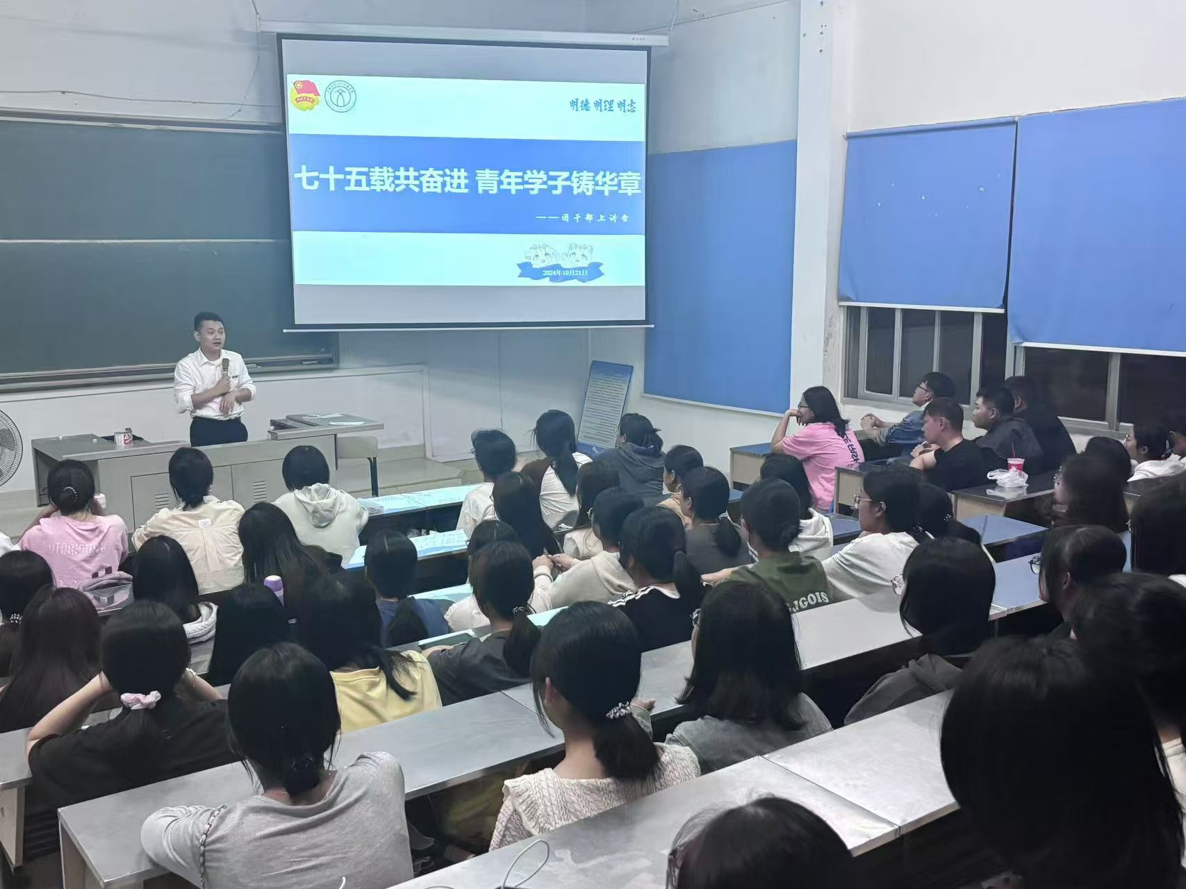 七十五年砥砺前行,青春书写壮丽篇章。院团委负责人强调,七十五载的奋斗征程是在党的领导下不断前进的,我们要坚持党的领导,深入学习新中国发展史,走中国特色社会主义道路。在新时代、新起点要不忘初心、牢记使命,为实现中华民族伟大复兴的中国梦而不断奋进。