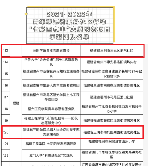 近日,团中央青年志愿者行动指导中心公布了一批青年志愿者服务社区行动“七彩四点半”示范团队,福建省共有10支志愿服务团队入选,我校青年志愿者协会、机器人协会临时党支部志愿服务队榜上有名。