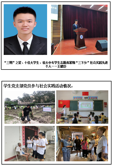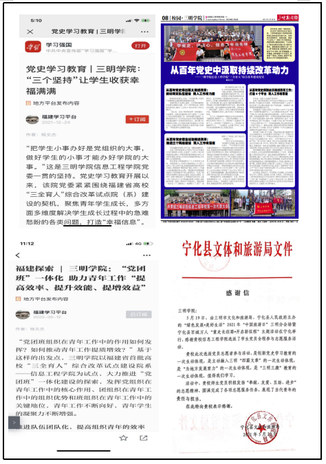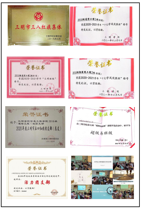 1.党支部引领“党团班”一体化建设有成效。“党团班”一体化建设过程中,各个组织聚焦主责主业,明确身份职责使命,强化自身建设,有力推动了党团班的组织建设。两年来,获“三明市五四红旗团委”1个,三明市“三八红旗集体”1个,获全国“活力团支部”1个,三明市“五四红旗团支部”1个,校级“十大学风优胜班”2个,校级“超级易班级”1个等。
