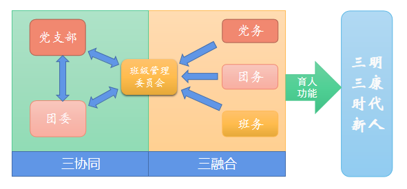 积极探索“党团班”组织管理体制的创新,在班级层面上,组建班级管理委员会。各个班级组建管理委员会设置委员5-7人,将党建、团建和班建原来的“三套班子”合为一体,管理委员会成员既是党务干部,又是团务干部,还是班务干部,推动党务、团务和班务深度融合。同时在低年级建立党员驻班联系制度,列席团支部和班级工作会议,指导班级团务和班务工作,发挥党建引领作用。在学院层面上,推进“党团班共同体”建设。学生党支部、学院团委和班级管理委员会学生干部交叉任职,破除三类组织相互隔离的情况,共同开展育人工作。通过两个层面的管理体制创新,奠定了“党团班”一体化建设的组织基础。